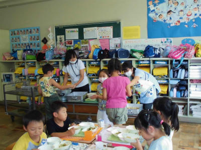 ランチルームには、7月生まれの子どもたちと教職員が集まって会食しました。