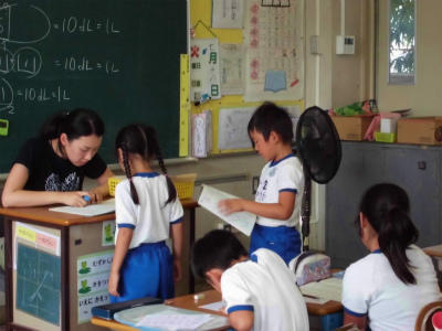 高学年児童が「スマイル先生」になって低学年児童の学習を支援することもあります。