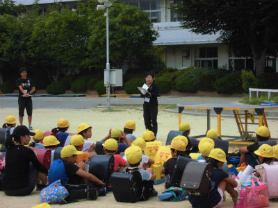 自分の命は自分で守ること、下校後や休日の遊び方にも注意すること、道路の歩き方や通学班登校について子どもたちに指導しました。