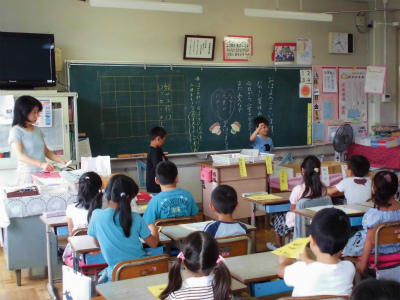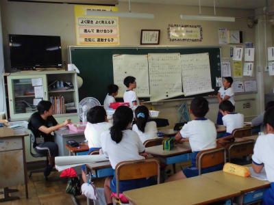 1年生は5時間で終了です。帰りの会では、明日の予定を黒板に貼りだし、帰りの支度をしています。スムースにできるようになっています。