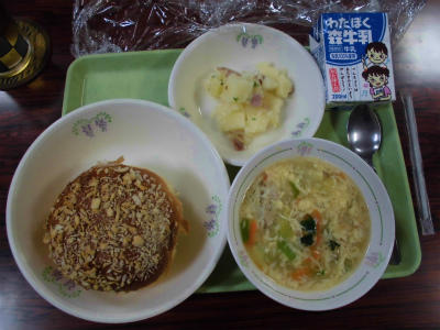 焼きカレーパン、牛乳、ジャーマンポテト、卵スープ