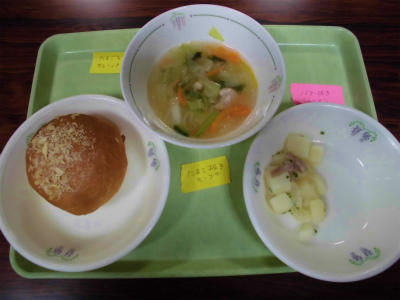 アレルギー対応は、卵抜き焼きカレーパン、バター抜きジャーマンポテト、卵抜きスープ