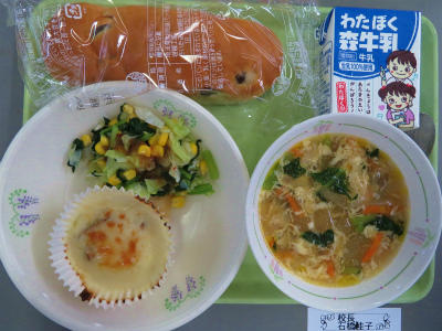 ぶどうパン、牛乳、シーフードグラタン、コーンサラダ、冬瓜スープ