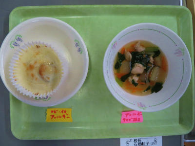 アレルギー対応は、イカ・えび抜きのグラタン、卵抜きスープ