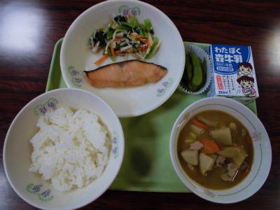 ごはん、牛乳、鮭の塩麹焼き、きのこ和え、芋煮、だだちゃ豆