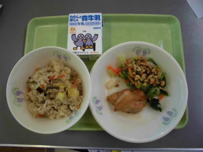 さつまいもごはん 牛乳 鶏肉の照り焼き くるみあえ
