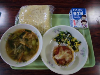 広東麺、牛乳、かぼちゃのミートソース焼き、ポパイサラダ