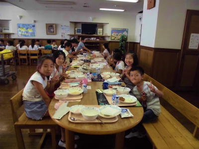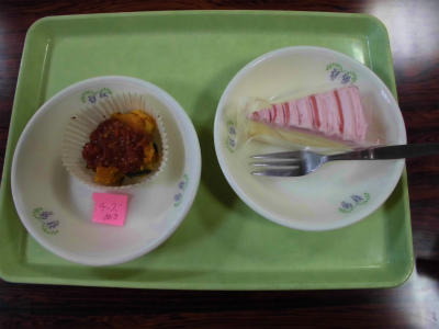 ランチルームでの給食、お誕生日ケーキも出て、9月生まれの人はご機嫌です。