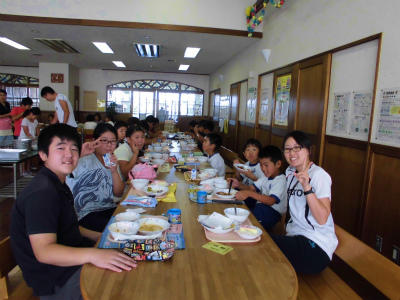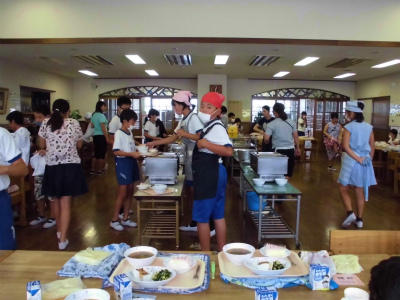 ランチルームでの給食、とても嬉しそうです。高学年の児童が給食当番です。