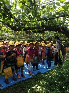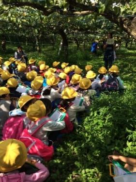 梨の種類、とれ高などのお話を分かりやすく説明していただいています。豊春小の全員の子どもが、一年間で百個食べられるくらい、田口梨園さんでは収穫できるとのことです。