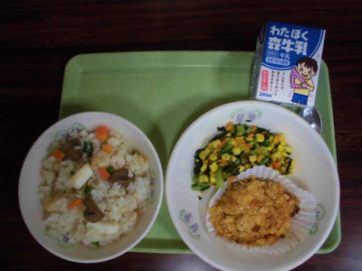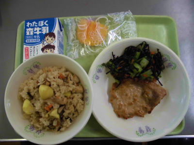 秋の香りごはん 牛乳 ぶた肉のつけ焼き 塩こんぶ炒め 柿