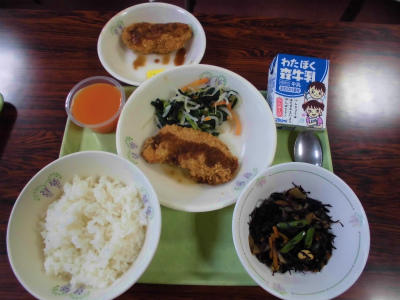 ごはん 牛乳 かぼちゃの肉巻きフライ 小松菜のおひたし ひじきの煮物 にんじんゼリー