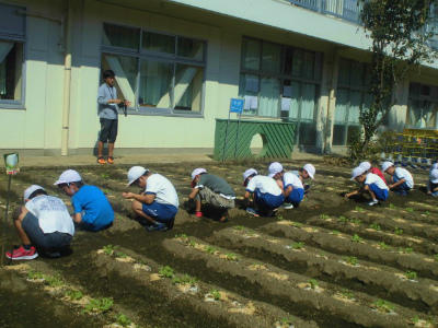いつもお世話になっている学校応援団コーディネーターの細井さんから、いろいろと教えていただきながら種まきをしています。