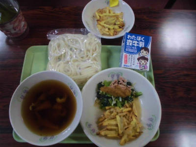 きつねうどん(地粉うどん、汁)、牛乳、さつまいものかき揚げ、おろしあえ