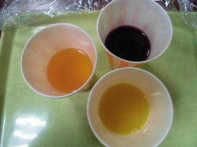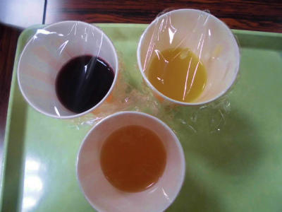 交流給食は4年生紅組です。ランチルームでジュースをいただきます。
