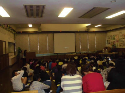 助産師の宇田川先生を講師としてお迎えして、人が産まれてくることに関するお話を伺っています。役員のお母様方が子どもたち肉合ってくださっているのは…