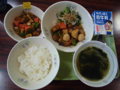ごはん、牛乳、酢豚、小松菜のナムル、わかめスープ