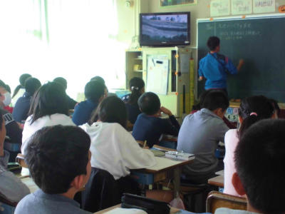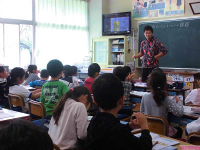 6年生英語活動 英語でピントを出し合い、国の名前をあてる学習です。知っている英単語を一生懸命使って、コミュニケーションをとろうとしています。