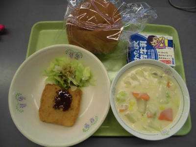 二色揚げパン、牛乳、ポークビーンズ、蓮花湯