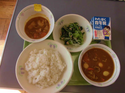 カレーライス(麦ごはん)、牛乳、小松菜と春雨のソテー