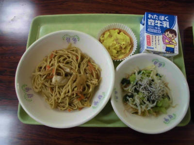 焼きそば、牛乳、さつまいものタルト、青菜とじゃこのサラダ