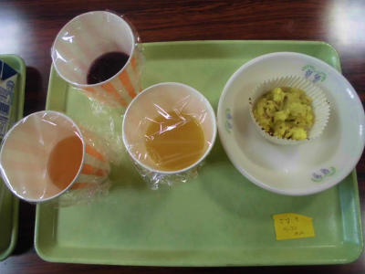 アレルギー対応でタルトぬきのさつまいも、交流給食5年生紅組児童にはオレンジズジュース、りんごジュース、ぶどうジュースのセレクトでした。