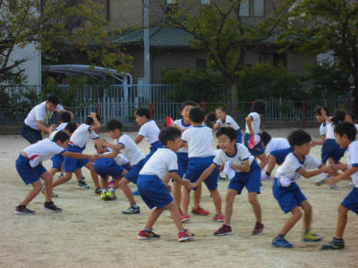 ジャンケンに負けた児童は、ぐるりと回転して姿勢を変えます。