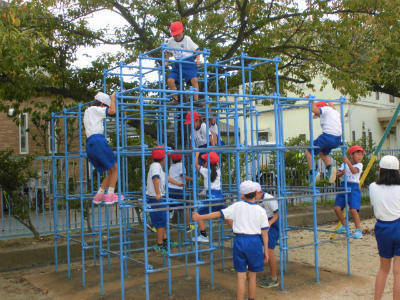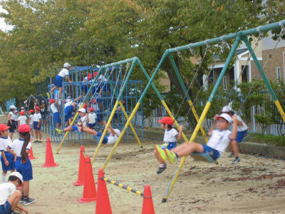 雲梯では、中学年の子がいろいろな渡り方をしていました。
