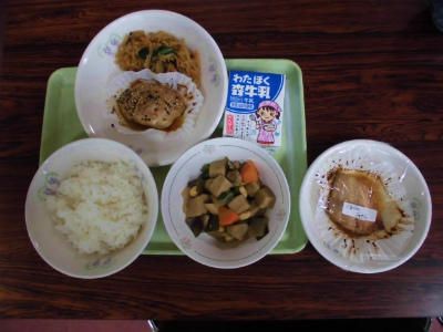<きょうの献立>ごはん、牛乳、とり肉の金山寺みそ焼き、磯香和え、豚肉と大根の煮物