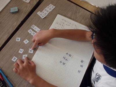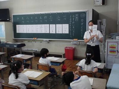 【1年生 国語】カタカナの練習をしています。練習帳に書く前に、宙書きと指書きをしています。