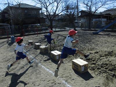 【1年生 体育】目標物を決めて飛び越す練習をしました。
