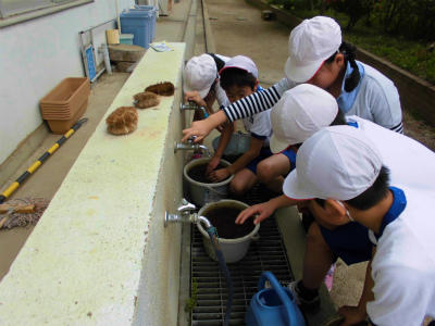 水を入れた土を混ぜています。久しぶりにどろんこ遊びだ!と言っている子も。