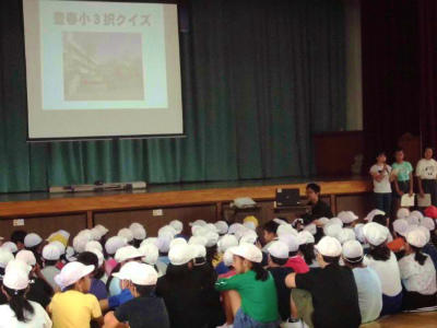 代表委員児童による豊春小三択クイズ大会の開催です。帽子を赤、白に被りかえることで答えを選んだり、帽子を脱いで黒が表す答えを選んだりして楽しみました。運動会に関わるクイズもありました。