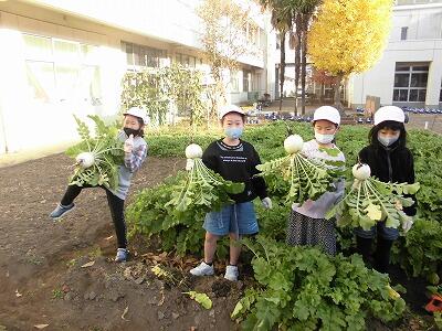 みんなで楽しく収穫ができました。今日2年生はカブとダイコンを持ち帰ります。