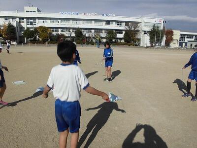 1年生は「ボール蹴りゲーム」を行っています。ボールの操作や的当てなど楽しく授業をしていました。