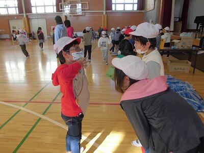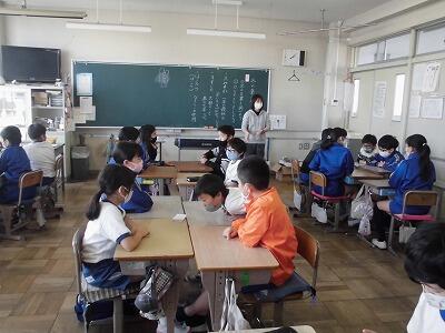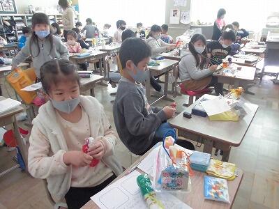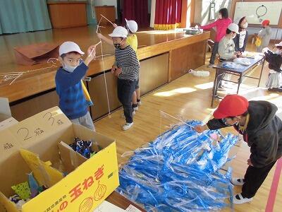 本日の午前中に2年生が「遊びランド」を開催し、1年生がお客さんとなり、いろいろなゲームで楽しみました。これまでに2年生は、生活科の時間に一年生が楽しめる遊びと景品作りを行い、1年生を楽しませる工夫を考えて計画、実行しました。今日の本番は、新型コロナウイルス感染症対策を十分に行い、1年生の一クラスづつ時間を決めて遊びに来ました。