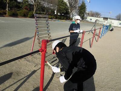 今日の5・6時間目に、6-2が豊プロ「学校をよりよくきれいにしよう」で校庭のペンキ塗りをしてくれました。今まで遊んできた遊具をきれいにしたいという気持ちからクラスみんなで協力してがんばりました。