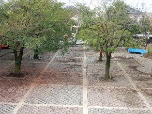 台風一過、落ち葉や枯れ枝の散らかっている中庭や校庭の