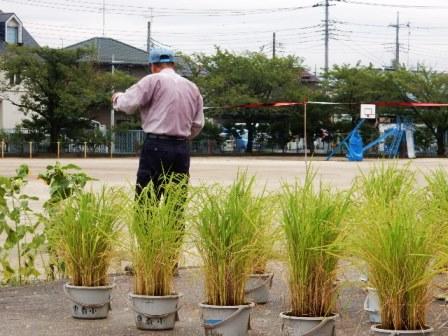 プールに入りに来た5年生の児童が稲穂を見ながら応援団の方と話しています。