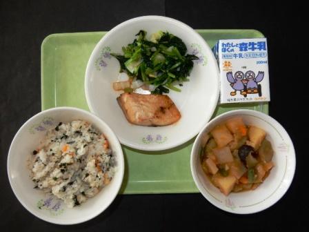 ごはん 牛乳 鮭のもみじ焼き キャベツのピーナッツあえ 凍り豆腐の煮物