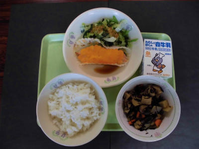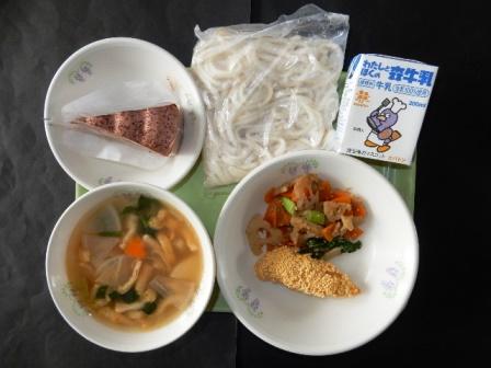 しっぽくうどん(地粉うどん・汁)、ささみの雑穀揚げ、れんこんのきんぴら、牛乳です。