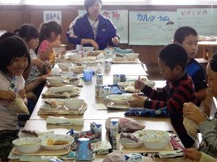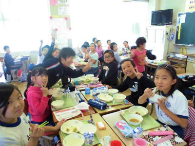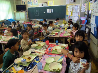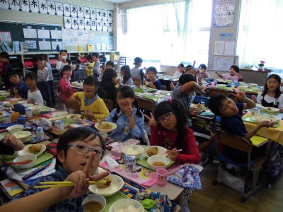 1,3,4年生の給食時間の様子です。みんなよく食べています。残さず食べられるとよいですね。