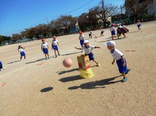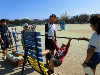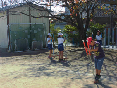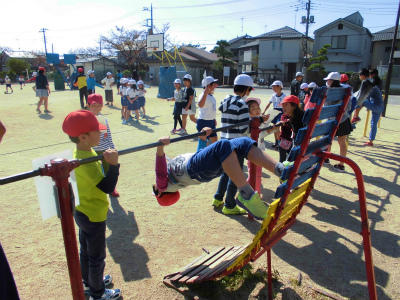 休み時間の校庭での様子です。鉄棒教室、なわとび、ドッチボール、竹馬など様々なことをして過ごしています。