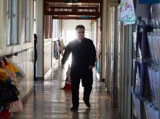 廊下そうじをがんばっています。すみずみまできれいですね。