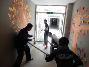 先生方は刺股や箒等を持って不審者を教室から遠ざけるように