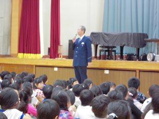 不審者役を行う警察官の方から、1年3組の子どもたちに