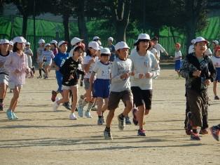 早めに校庭に来て朝マラソンに取り組む子どもたちです。