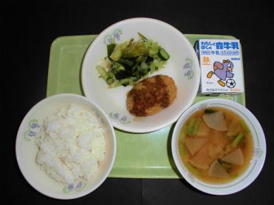 秋の香りごはん 牛乳 根菜ハンバーグ 切り干し大根のごまよごし