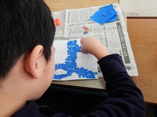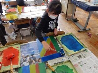 2年生も図工で、紙で型を取ってステンシルで彩色する版画です。