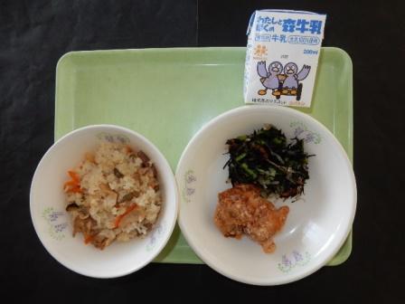 中華風炊き込みごはん、とり肉の竜田揚げ、ひじきの五色炒め、牛乳です。